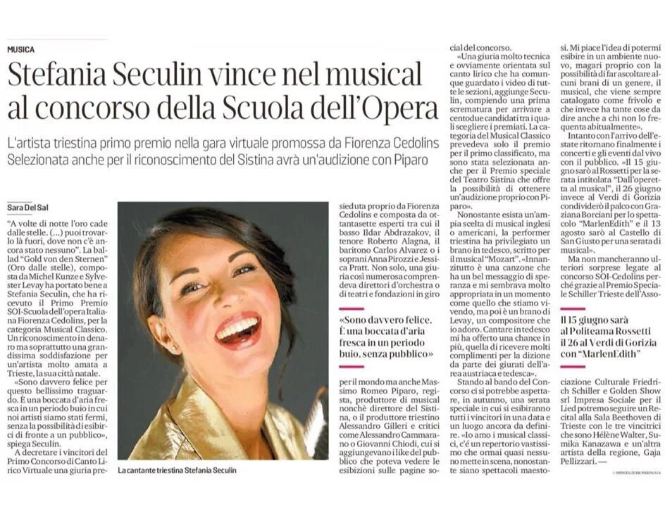 Nel 2021 vince il Primo Premio SOI Scuola dell’Opera Italiana Fiorenza Cedolinz per la categoria Musical Classico con in brano “Gold von den Sternen” dal musical Mozart! di Sylvester Levay e Michale Kunze.